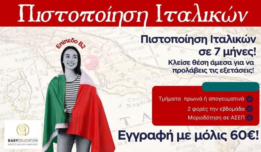 Αν θέλεις να αποκτήσεις αναγνωρισμένο πτυχίο Ιταλικών και να ξεχωρίσεις ακαδημαϊκά ή επαγγελματικά, τα ΚΔΒΜ Easy Education σου προσφέρουν το ιδανικό πρόγραμμα για το επίπεδο Β2. Σε μόλις 7 μήνες εντατικής προετοιμασίας, έχεις τη δυνατότητα να συμμετάσχεις στις εξετάσεις PLIDA, CELI ή Κρατικού Πιστοποιητικού Γλωσσομάθειας (ΚΠΓ) και να εξασφαλίσεις μια πιστοποίηση με διεθνή αναγνώριση.