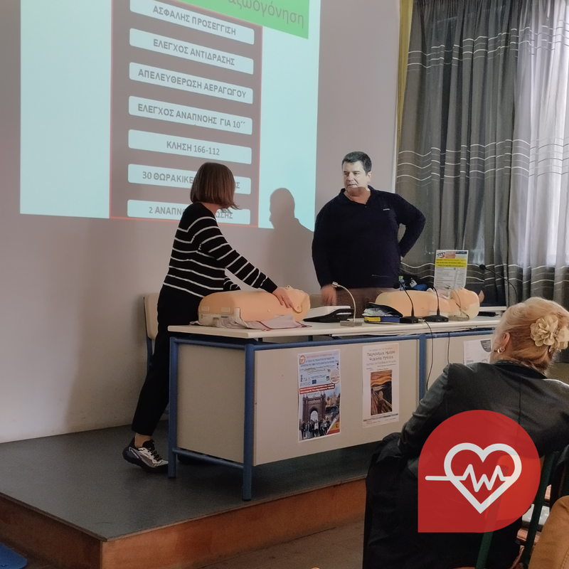 Η δεύτερη δράση αφορούσε στην επιμόρφωση των καθηγητών του σχολείου στην ΚΑΡΠΑ και στη χρήση αυτόματου εξωτερικού απινιδωτή. Εισηγητής ο κ. Σδόγκος Ευάγγελος, ιατρός καρδιολόγος. Η αμεσότητα και η μεταδοτικότητα του κατέστησαν εφικτό να αφομοιωθούν οι προσδοκώμενες γνώσεις.
