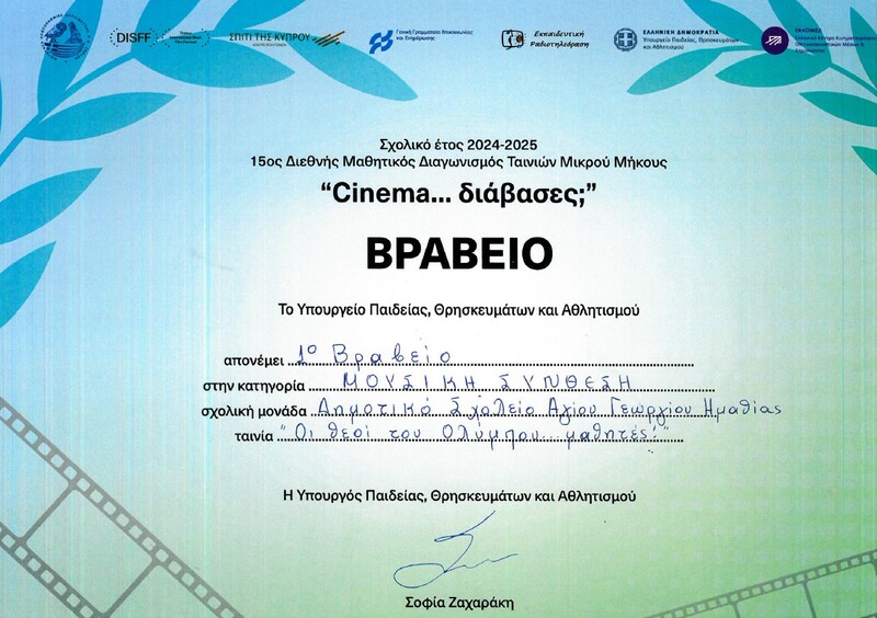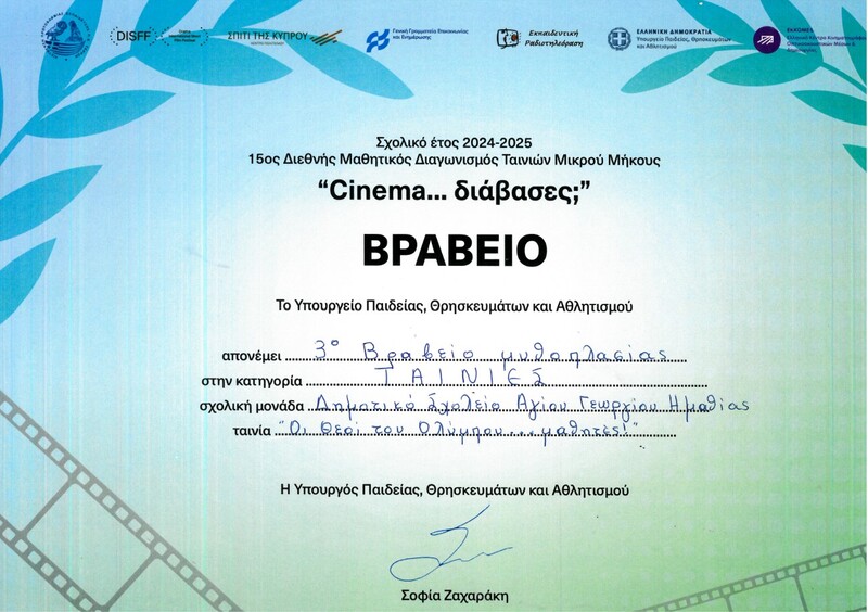 Οι Θεοί του Ολύμπου…μαθητές! Με ιδιαίτερη χαρά και υπερηφάνεια το Δημοτικό Σχολείο Αγίου Γεωργίου ανακοινώνει τη βράβευση των μαθητών/μαθητριών στο 15ο Διεθνή Μαθητικό Διαγωνισμό Ταινιών Μικρού Μήκους “Cinema…Διάβασες;” η οποία πραγματοποιήθηκε παρουσία παιδιών, εκπαιδευτικών και γονέων στις 17 Δεκεμβρίου 2025 στο Κέντρο Πολιτισμού “Ελληνικός Κόσμος”.