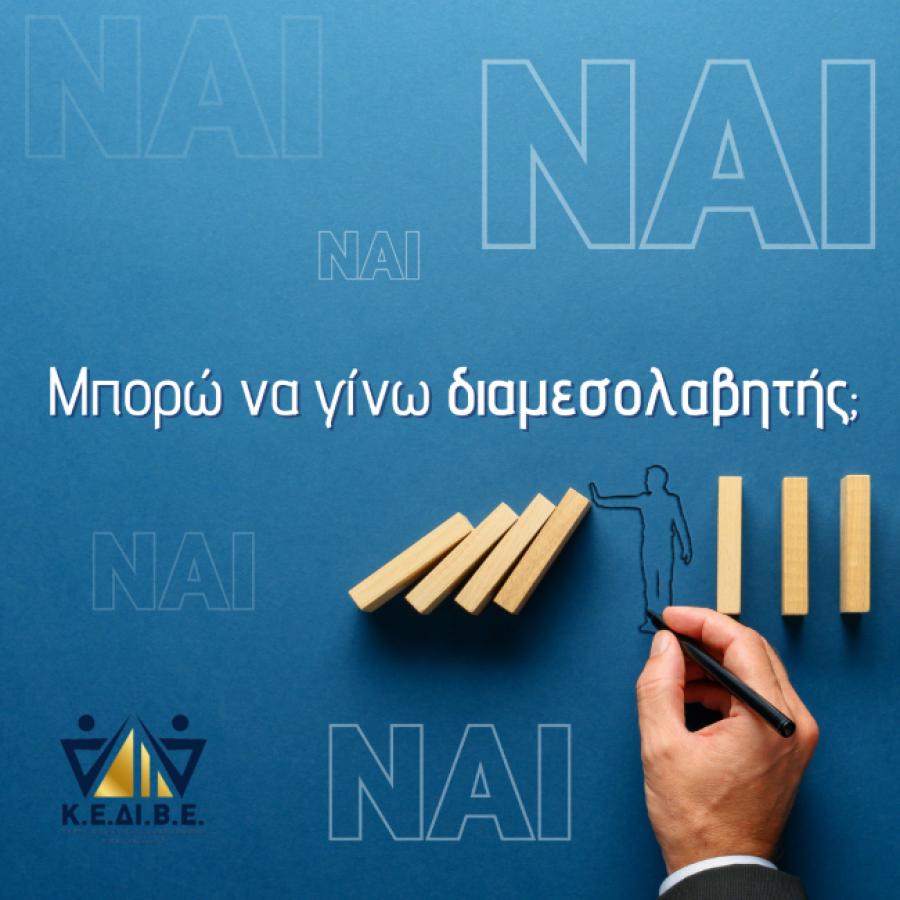 Το ΚΕΔΙΒΕ προσφέρει πρόγραμμα με τίτλο «ΒΑΣΙΚΗ ΕΚΠΑΙΔΕΥΣΗ ΔΙΑΜΕΣΟΛΑΒΗΤΩΝ» και για τους ήδη πιστοποιημένους διαμεσολαβητές προσφέρονται ΜΕΤΕΚΠΑΙΔΕΥΣΕΙΣ. Μάθε περισσότερα στο www.kedive.gr