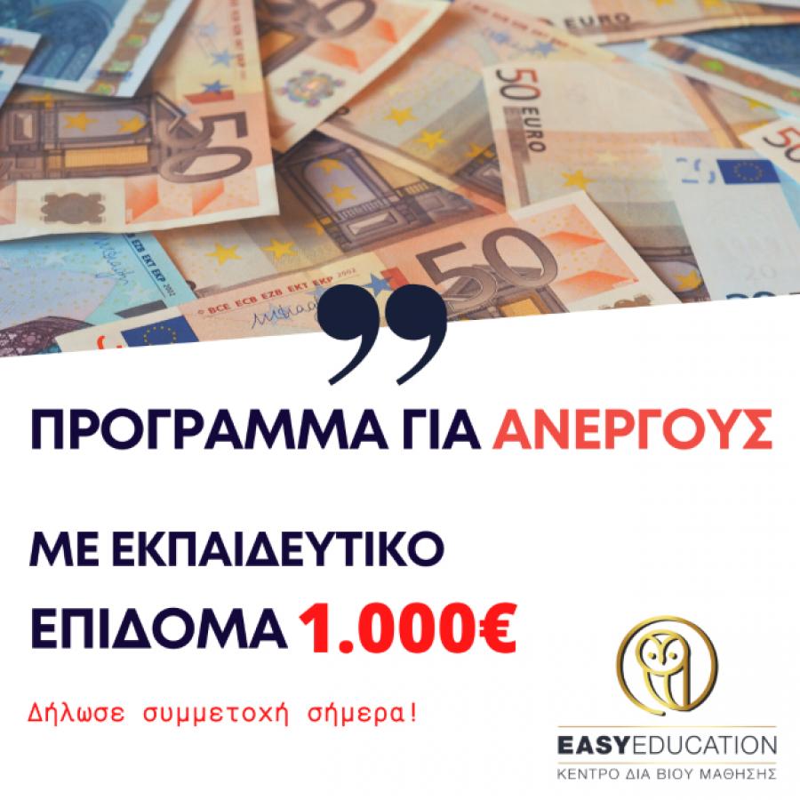 Η Easy Education, που βρίσκεται στο χώρο των voucherαπό το 2013, θα υλοποιήσει πληθώρα προγραμμάτων διάρκειας 200 ωρών ώστε οι ωφελούμενοι άνεργοι να λάβουν τα μέγιστα οφέλη τόσο εκπαιδευτικά όσο και οικονομικά (λήψη του μέγιστου δυνατού ποσού, 1.000€).