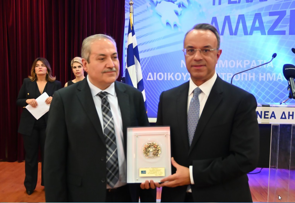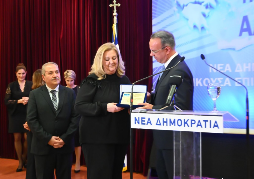 Ιδιαίτερα συγκινητική ήταν η στιγμή όπου ο Υπουργός κ. Σταϊκούρας απέμεινε τιμητική πλακέτα της Δ.Ε.Ε.Π. Ημαθίας στη μνήμη του πρόσφατα χαμένου Νίκου Τάκη, Προέδρου της ΔΗΜ.Τ.Ο. Αλεξάνδρεια, στη γυναίκα του κ. Ρούλα Χαριτάκη.