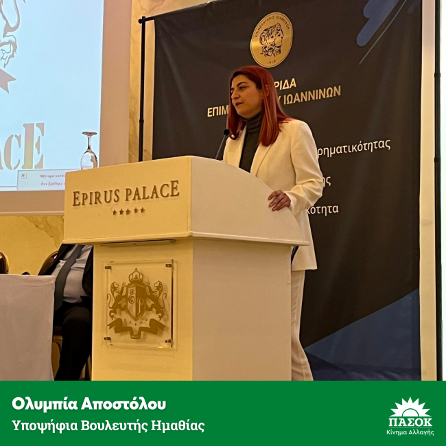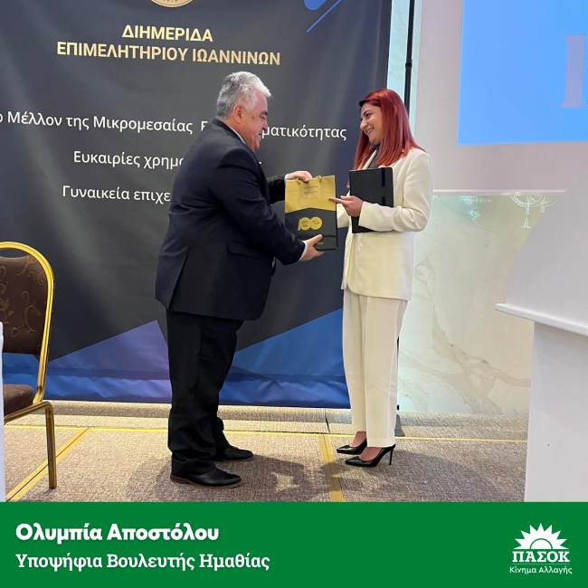Η Ολυμπία Αποστόλου, μέλος του Πολιτικού Συμβουλίου του ΠΑ.ΣΟ.Κ. - Κίνημα Αλλαγής και υποψήφια βουλευτής Ημαθίας, εκπροσώπησε το Κίνημα σε Διημερίδα για τη Μικρομεσαία Επιχειρηματικότητα που διοργάνωσε το Επιμελητήριο Ιωαννίνων στις 7-8 Απριλίου.