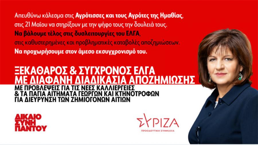Απευθύνω κάλεσμα στις Αγρότισσες και τους Αγρότες της Ημαθίας, στις 21 Μαΐου να στηρίξουν με την ψήφο τους την δουλειά τους. Να βάλουμε τέλος στις δυσλειτουργίες του ΕΛΓΑ, στις καθυστερημένες και προβληματικές καταβολές αποζημιώσεων.Να προχωρήσουμε στονάμεσο εκσυγχρονισμό του.