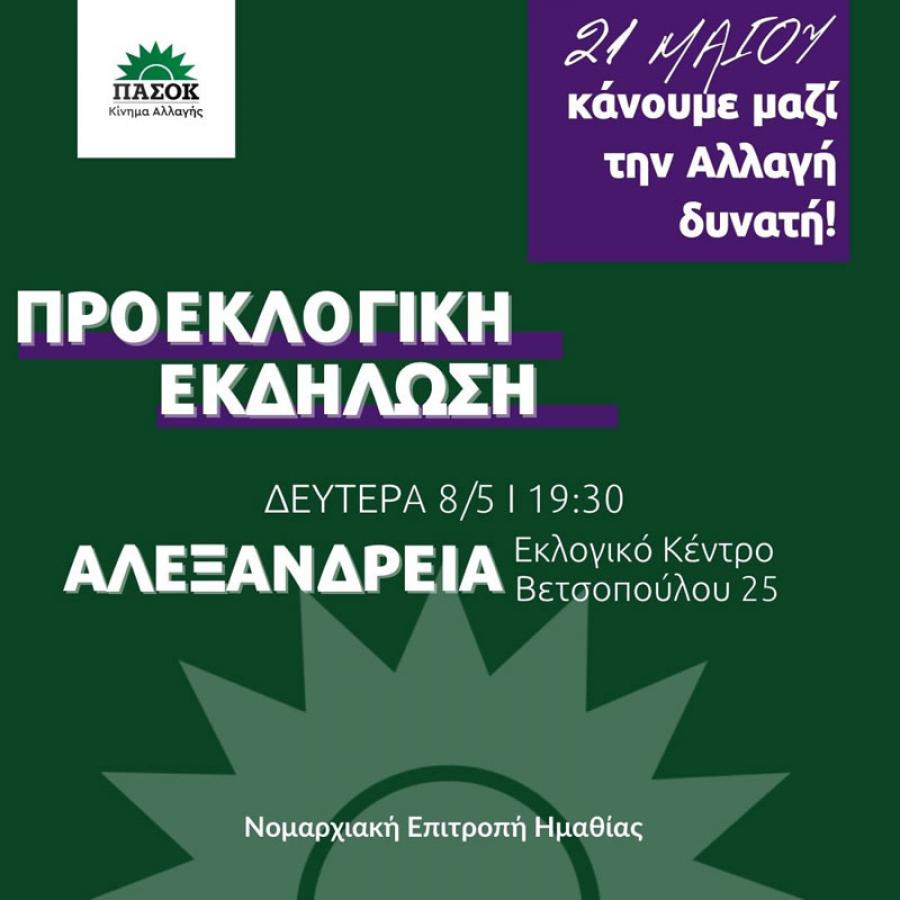 Πρόσκληση της Νομαρχιακής Επιτροπής ΠΑΣΟΚ-Κίνημα Αλλαγής Ημαθίας στην προεκλογική εκδήλωση την Δευτέρα 8 Μαΐου και ώρα 19:30 μ.μ. στο εκλογικό κέντρο Αλεξάνδρειας, Βετσοπούλου 25.