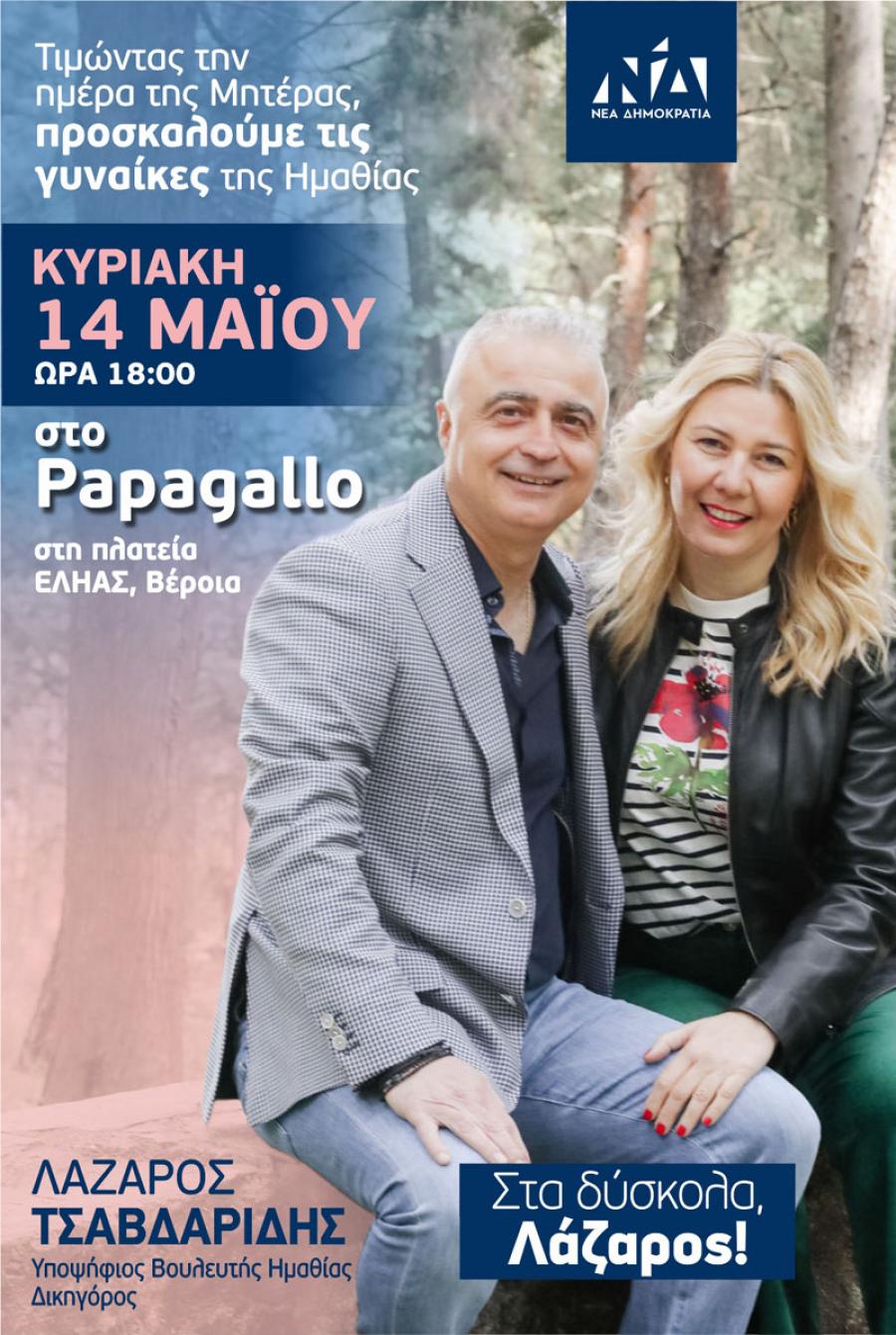 Τιμώντας την ημέρα της Μητέρας, προσκαλούμε τις ΓΥΝΑΙΚΕΣ της ΗΜΑΘΙΑΣ την Κυριακή 14 Μαΐου στο PAPAGALLO, στην πλατεία Εληάς, στη Βέροια. Λάζαρος Τσαβδαρίδης Υποψήφιος Βουλευτής Νέα Δημοκρατία