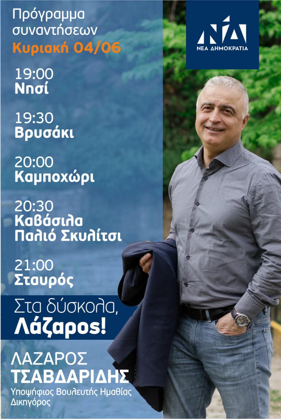 Το πρόγραμμα προεκλογικών επισκέψεων την Κυριακή του Λάζαρου Τσαβδαρίδη