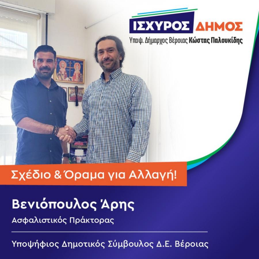 Καλωσορίζουμε στον συνδυασμό μας ΙΣΧΥΡΟΣ ΔΗΜΟΣ - ΚΩΣΤΑΣ ΠΑΛΟΥΚΙΔΗΣ, και τον Βενιοπουλου Άρη, ο οποίος συντάσσεται στον κοινό μας αγώνα για την αλλαγή στον Δήμο Βέροιας.