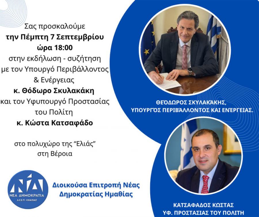 Εκδήλωση - συζήτηση με τον Υπουργό Περιβάλλοντος & Ενέργειας κ. Θόδωρο Σκυλακάκη και τον Υφυπουργό Προστασίας του Πολίτη κ. Κώστα Κατσαφάδο, θα γίνει την Πέμπτη 7 Σεπτεμβρίου και ώρα 18:00 στην στο πολυχώρο της “Ελιάς” στη Βέροια.