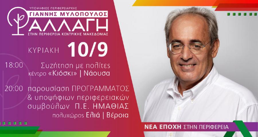 Περιοδεία στην Περιφερειακή Ενότητα Ημαθίας θα πραγματοποιήσει την Κυριακή 10 Σεπτεμβρίου 2023ο υποψήφιος περιφερειάρχης με την παράταξη «Αλλαγή στην Περιφέρεια Κεντρικής Μακεδονίας», καθηγητής και πρώην πρύτανης του ΑΠΘ, Γιάννης Μυλόπουλος.