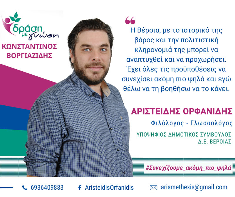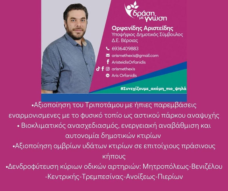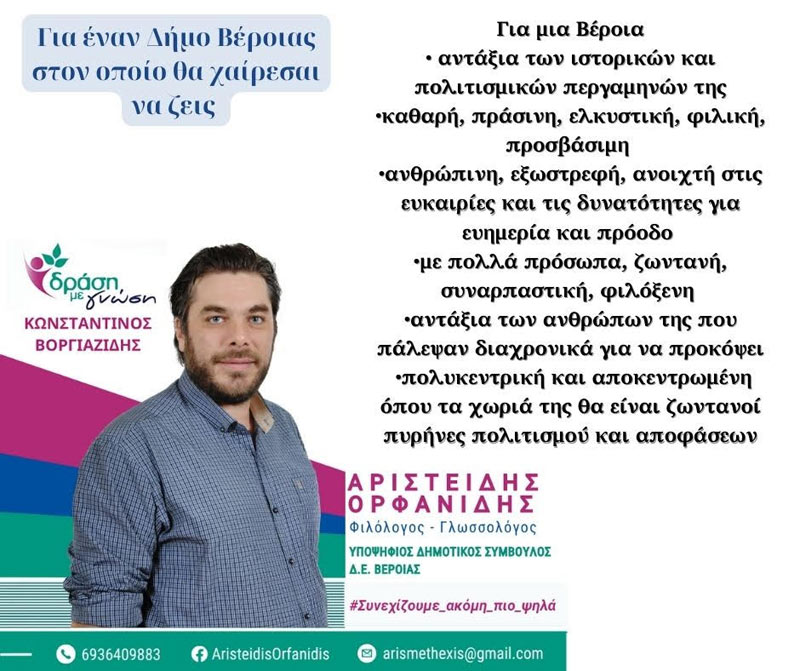 Αν θέλετε κάποιον στον δήμο που θα έχει την πυγμή και την παρρησία να υπερασπίζεται το κοινό καλό με γνώμονα μόνο την πρόοδο του τόπου, μακριά από καιροσκοπικά ιδιοτελή συμφέροντα, τότε ζητώ σεμνά και συνάμα περήφανα τη στήριξή σας.