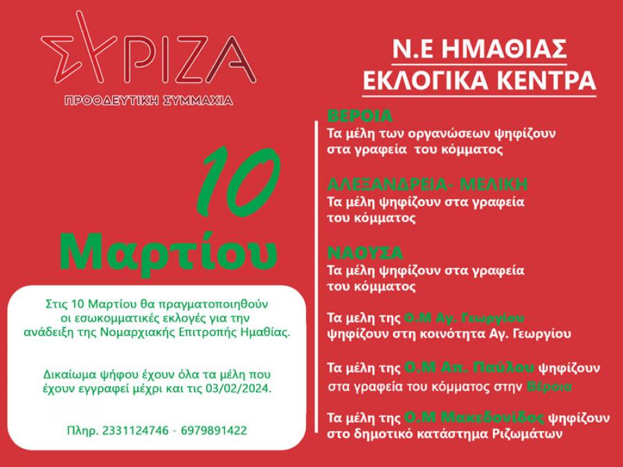 Την Κυριακή 10/3/2024 και από ωρα 10.00- 6.00 μ.μ θα γίνουν εκλογές για την ανάδειξη της νέας Ν.Ε του ΣΥΡΙΖΑ-ΠΣ Ημαθίας.