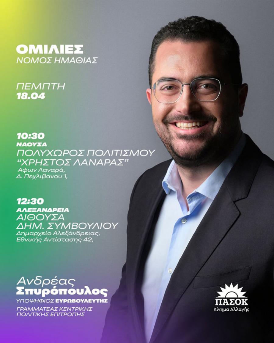 Στην Ημαθία θα βρεθεί τηνΠέμπτη 18 Απριλίου 2024 ο Ανδρέας Σπυρόπουλος, Γραμματέας ΚΠΕ και υποψήφιος ευρωβουλευτής του ΠΑΣΟΚ-Κινήματος Αλλαγής στο πλαίσιο της προεκλογικής του εκστρατείας. Αναλυτικά το πρόγραμμα της περιοδείας του έχει ως εξής: