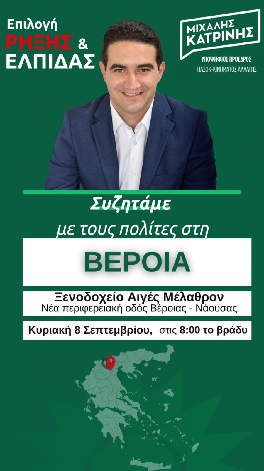 Ο υπ. Πρόεδρος του ΠΑΣΟΚ κ. Μιχάλης Κατρίνης επισκέπτεται την Κυριακή 8 Σεπτεμβρίου την Βέροια, συνεχίζοντας την επικοινωνία του με τους πολίτες.