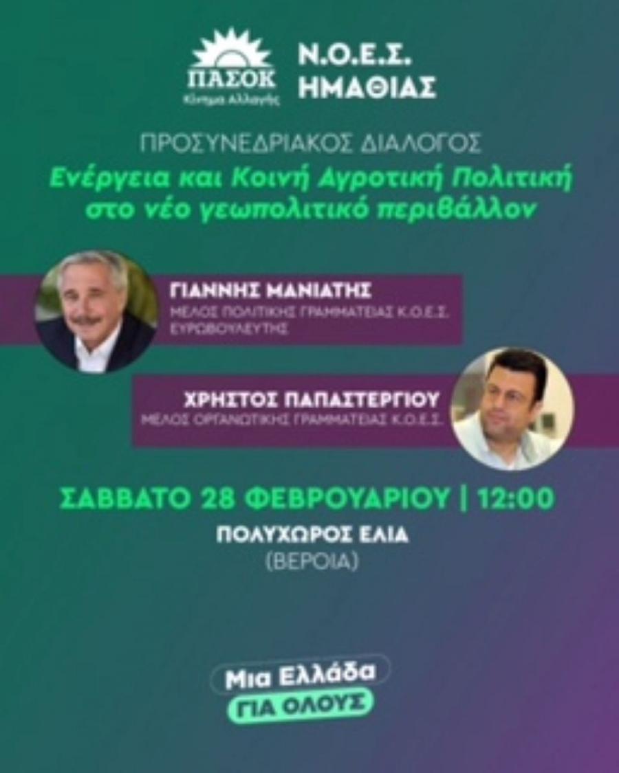 Εκδήλωση προσυνεδριακού διαλόγου διοργανώνει η Νομαρχιακή Οργανωτική Επιτροπή Συνεδρίου του ΠΑΣΟΚ - Κίνημα Αλλαγής Ημαθίας, με τη συμμετοχή του Ευρωβουλευτή και μέλος της Πολιτικής Γραμματείας Κ.Ο.Ε.Σ. Γιάννη Μανιάτη και του μέλους της Οργανωτικής Γραμματείας Κ.Ο.Ε.Σ. Χρήστου Παπαστεργίου.