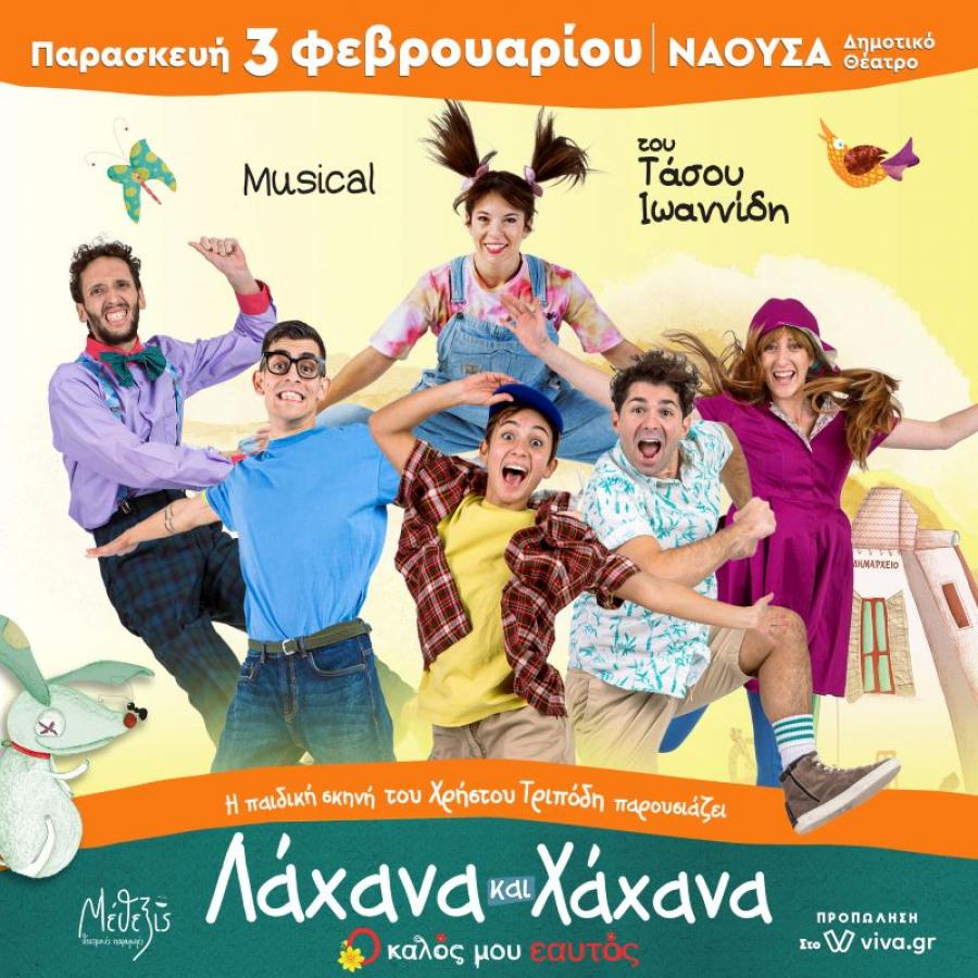 Μετά τη sold out περιοδεία του καλοκαιριού σε όλη την Ελλάδα και, παράλληλα με τις παραστάσεις στο «Θέατρον» του Κέντρου Πολιτισμού «Ελληνικός Κόσμος», η παιδική σκηνή του Χρήστου Τριπόδη και η εταιρεία ΜΕΘΕΞΙΣ παρουσιάζουν στο κοινό της περιφέρειας το αγαπημένο μιούζικαλ για παιδιά του Τάσου Ιωαννίδη, «Λάχανα και Χάχανα - Ο Καλός μου Εαυτός». Το έργο θα «ταξιδέψει» την Παρασκευή 3 Φεβρουαρίου 2023 στο Δημοτικό Θέατρο Νάουσας, σε διπλή παράσταση στις 17:00 και στις 19:00.