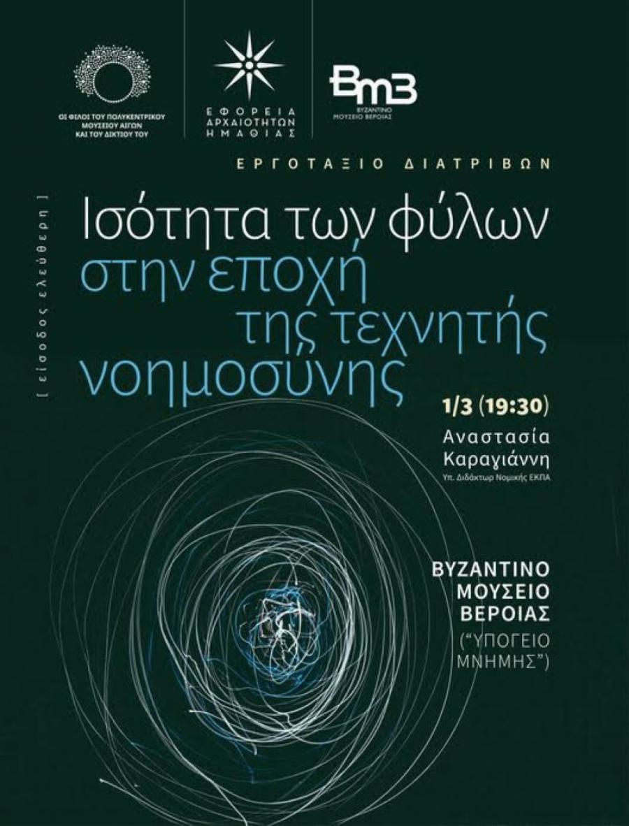 Οι Φίλοι του Πολυκεντρικού Μουσείου των Αιγών & του Δικτύου του και η Εφορεία Αρχαιοτήτων Ημαθίας σας προσκαλούν την Τετάρτη 1/3 (19:30) στο Βυζαντινό Μουσείο Βέροιας («Υπόγειο της Μνήμης»), στην διάλεξη της κας Αναστασίας Καραγιάννη με θέμα: «Ισότητα των φύλων στην εποχή της τεχνικής νοημοσύνης».