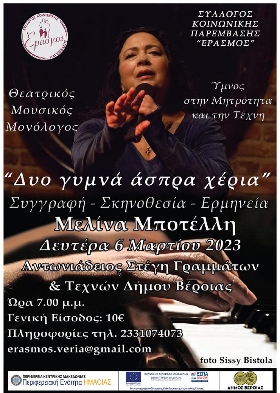 Η Μελίνα Μποτέλλη, μία από τις κορυφαίες ηθοποιούς της Ελλάδας, ερμηνεύει τον Θεατρικό –Μουσικό Μονόλογο με τίτλο «ΔΥΟ ΓΥΜΝΑ ΑΣΠΡΑ ΧΕΡΙΑ», σε κείμενο, σκηνοθεσία, φωτισμούς και ερμηνεία της ιδίας, στη ΒΕΡΟΙΑ, τη Δευτέρα 6 Μαρτίου 2023, στις 7 το απόγευμα, στην Αντωνιάδειο Στέγη Γραμμάτων και Τεχνών.
