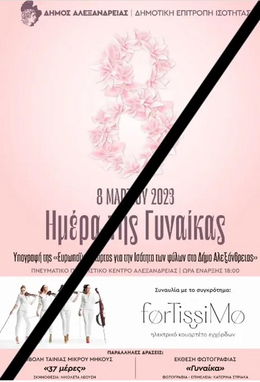 Αναβάλλονται οι προγραμματισμένες εκδηλώσεις στο Πνευματικό Κέντρο για την 8η Μαρτίου, Ημέρα της Γυναίκας, όπως και η τελετή για την Υπογραφή της “Ευρωπαϊκής Χάρτας για την Ισότητα των φύλων στο Δήμο Αλεξάνδρειας”, σε ένδειξη πένθους για τα θύματα του σιδηροδρομικού δυστυχήματος στα Τέμπη.
