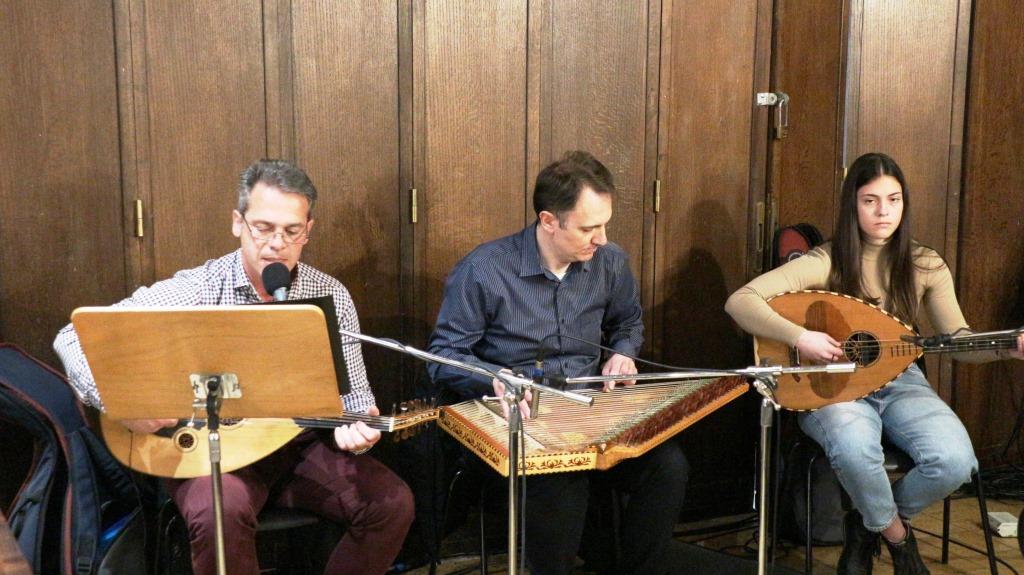 Ακολούθησε ένα μουσικό δείγμα από το CD με τους Ιορδάνη Κουτσιμανή στο ούτι και το τραγούδι, τον Βασίλη Γουδώνη στο κανονάκι και την Άννα Κουτσιμανή στο λαούτο.