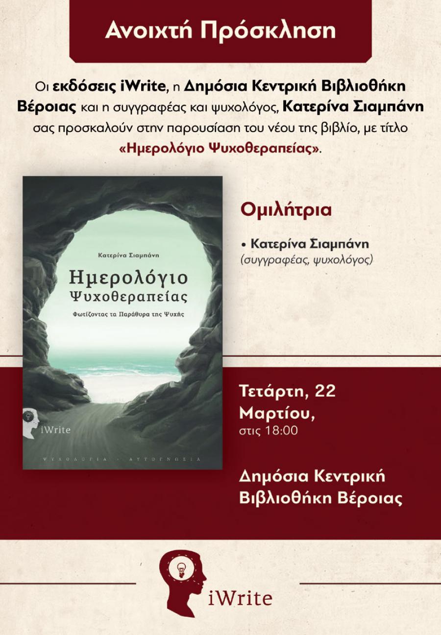 Οι εκδόσεις iWrite, η Δημόσια Κεντρική Βιβλιοθήκη της Βέροιας και η συγγραφέας - ψυχολόγος Κατερίνα Σιαμπάνη, σας προσκαλούν στην παρουσίαση του νέου της βιβλίου με τίτλο «Ημερολόγιο Ψυχοθεραπείας»