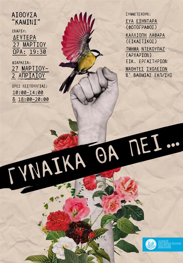 Μέχρι την Κυριακή 2 Απριλίου θα διαρκέσει η εικαστική έκθεση "Γυναίκα θα πει..." στην αίθουσα "Καμίνι, που διοργανώνει ο Δήμος Νάουσας στο πλαίσιο των δράσεών του για τον Μάρτιο, μήνα αφιερωμένο στη γυναίκα.