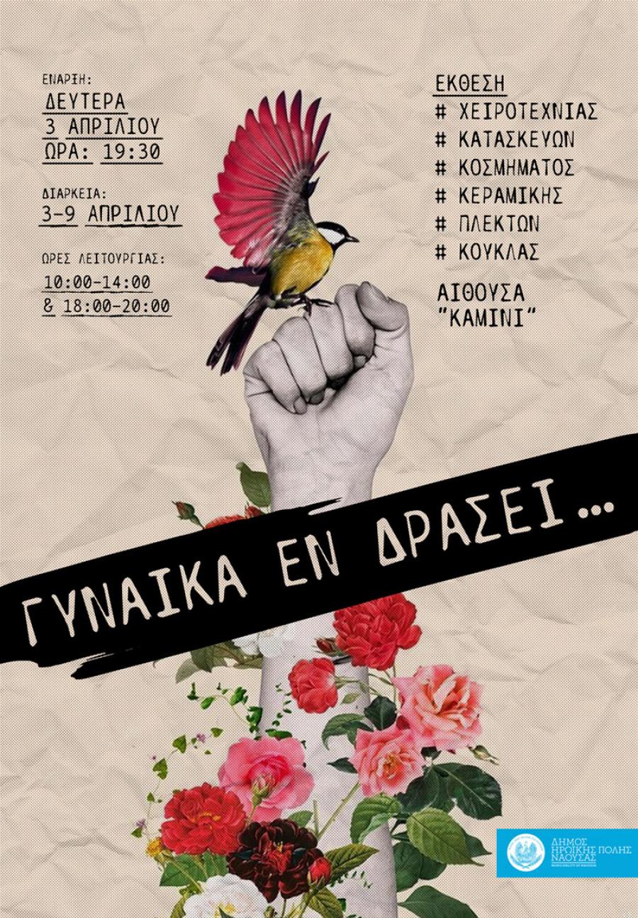 O Δήμος Ηρωικής Πόλης Νάουσας, μετά την ιδιαίτερα επιτυχημένη εικαστική έκθεση "Γυναίκα θα πει..." στην αίθουσα "Καμίνι", συνεχίζει τις εικαστικές δράσεις αφιερωμένες στη γυναίκα με τη νέα έκθεση χειροποίητων κατασκευών "Γυναίκα εν δράσει...". από 3 έως 9 Απριλίου 2023, με ελεύθερη είσοδο για το κοινό.