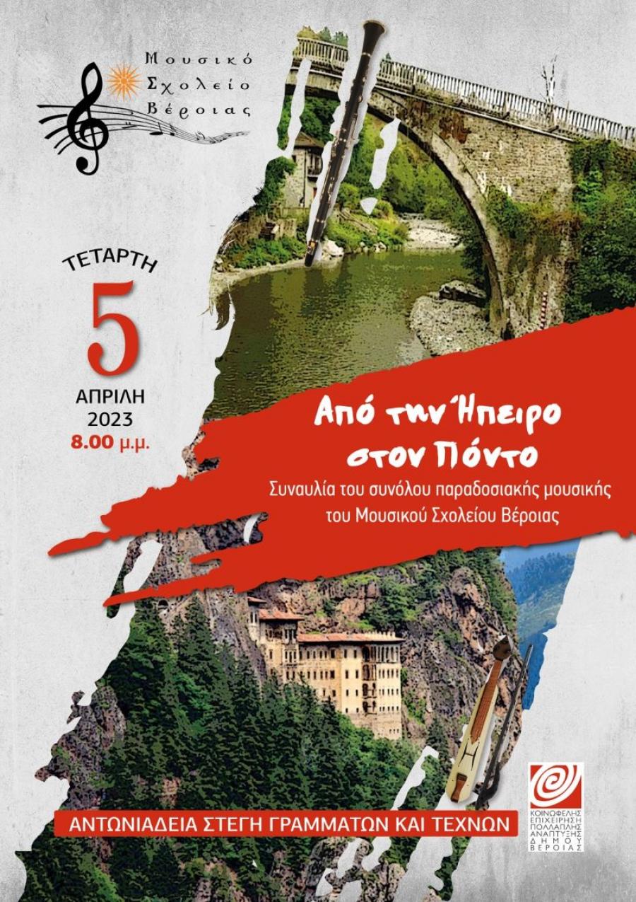 Σας προσκαλούμε στην συναυλία του Συνόλου Παραδοσιακής Μουσικής του Μουσικού Σχολείου Βέροιας η οποία θα πραγματοποιηθεί στην Αντωνιάδεια Στέγη Γραμμάτων & Τεχνών την Τετάρτη στις 5 Απριλίου 2023 και ώρα 20:00 με τίτλο Από την Ήπειρο στον Πόντο
