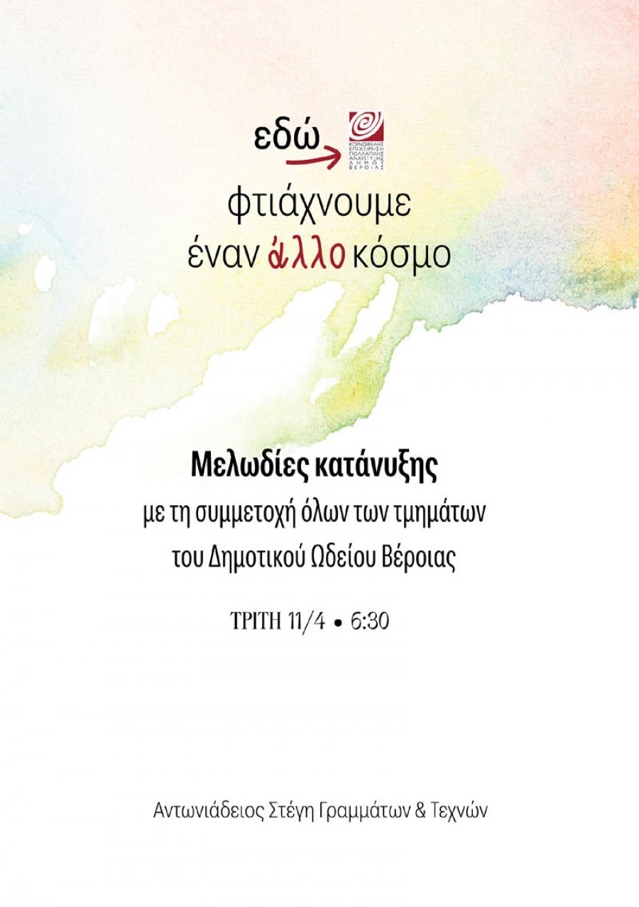 Μελωδίες κατάνυξης με μουσικά θέματα εμπνευσμένα από την Μεγάλη Εβδομάδα θα παρουσιάσουν οι σπουδαστές του Δημοτικού Ωδείου της ΚΕΠΑ Δήμου Βέροιας την Μεγάλη Τρίτη 11 Απριλίου 2023 στις 6:30μ.μ. στην Αντωνειάδειο Στέγη Γραμμάτων και Τεχνών.