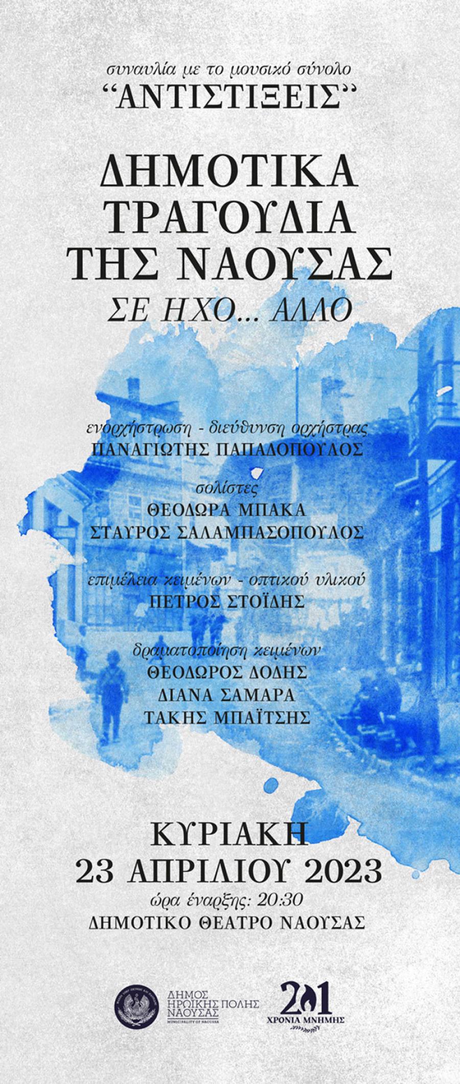 Στο πλαίσιο των εκδηλώσεων της 201ης Επετείου Ολοκαυτώματος της πόλης, ο Δήμος Ηρωικής Πόλης Νάουσας διοργανώνει συναυλία «Δημοτικά τραγούδια της Νάουσας σε ήχο... άλλο» με το μουσικό σύνολο "Αντιστίξεις" την Κυριακή 23 Απριλίου και ώρα 20:30 στο Δημοτικό Θέατρο Νάουσας "Μίκης Θεοδωράκης". Το πολυμελές μουσικό σύνολο, που πλαισιώνουν η μεσόφωνος Θεοδώρα Μπάκα και ο τενόρος Σταύρος Σαλαμπασόπουλος, θα παρουσιάσει δημοτικά τραγούδια της Νάουσας διασκευασμένα με σύγχρονα μουσικά όργανα με σεβασμό και προσήλωση στη μουσική γραμμή και το τοπικό γλωσσικό ιδίωμα, με συνοδεία οπτικού υλικού.