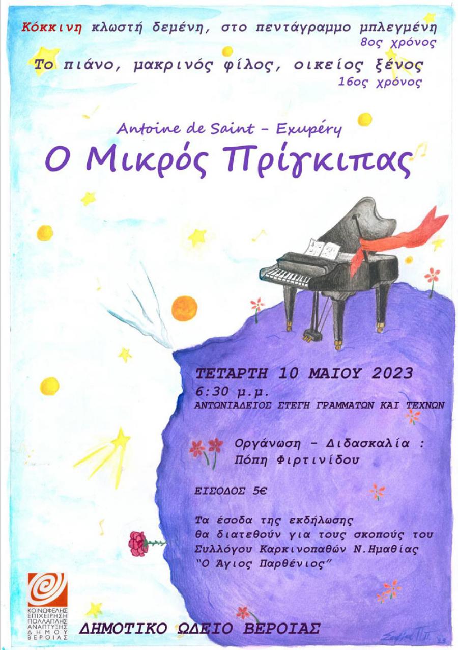 Την Τετάρτη 10 Μαΐου, στις 6.30 μμ στην Αντωνιάδειο Στέγη Γραμμάτων και Τεχνών το τμήμα πιάνου θα παρουσιάσει με μουσικό τρόπο το εμβληματικό έργο του Αντουάν Ντε Σεντ-Εξιπερί «ο Μικρός Πρίγκιπας» που από το 1943 μέχρι σήμερα διδάσκει την αλληλεγγύη και την αγάπη, δίνει χώρο σε όλων των ειδών τα συναισθήματα και προκρίνει την φαντασία έναντι του ορθολογισμού.