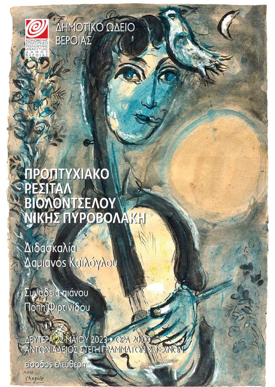 Την Δευτέρα 22 Μαϊου και ώρα 20.00 στην αίθουσα εκδηλώσεων της Αντωνιάδειου Στέγης Γραμμάτων και Τεχνών η μαθήτρια της τάξης του βιολοντσέλου του Δημοτικού Ωδείου Βέροιας Νίκη Πυροβολάκη θα παρουσιάσει το πτυχιακό της πρόγραμμα με έργα των J. S. Bach, C. Saint Saens, J. Haydn, J. Brahms κ.α. Στο πιάνο τη συνοδεύει η καθηγήτρια του Ωδείου Πόπη Φιρτινίδου.