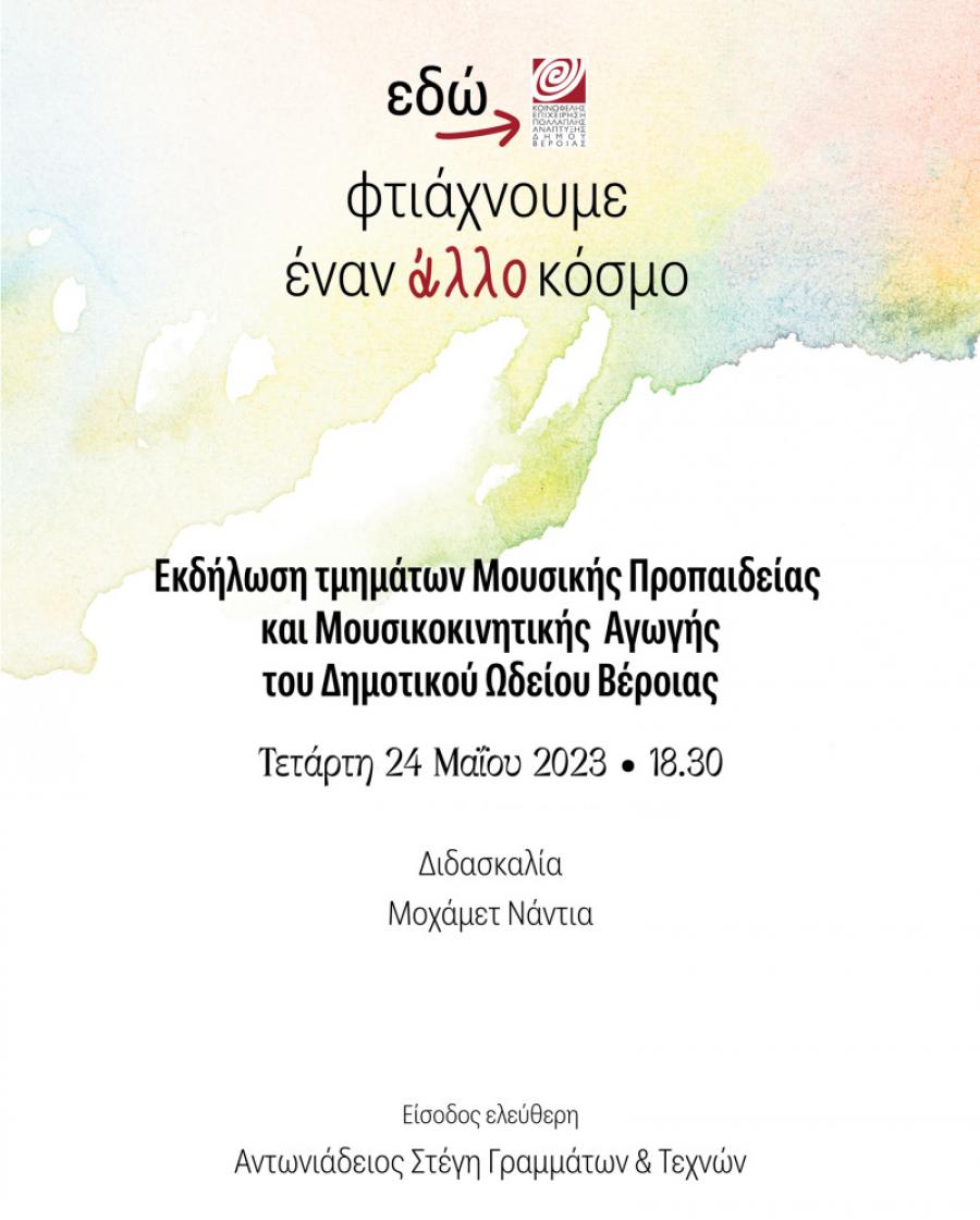 Την Τετάρτη 24 Μαΐου και ώρα 18.30 θα γίνει η ετήσια παρουσίαση των τμημάτων μουσικής προπαιδείας και μουσικοκινητικής αγωγής του Δημοτικού Ωδείου Βέροιας. Θα παρουσιαστούν τραγούδια, κινητικές δραστηριότητες και το παραμύθι των μαθητών «Μα που πήγε η φωνή;» αποδεικνύοντας τη τεράστια δύναμη της παιδικής φαντασίας και δημιουργικότητας!