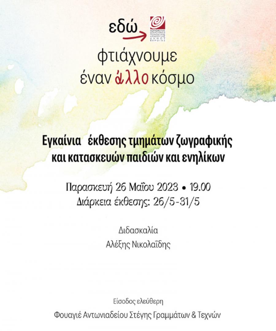 Την Παρασκευή 26 Μαΐου, στις 7 το απόγευμα θα γίνουν τα εγκαίνια της έκθεσης των τμημάτων κατασκευών, ενηλίκων και παιδιών, καθώς και έκθεση ζωγραφικής παιδικών τμημάτων.