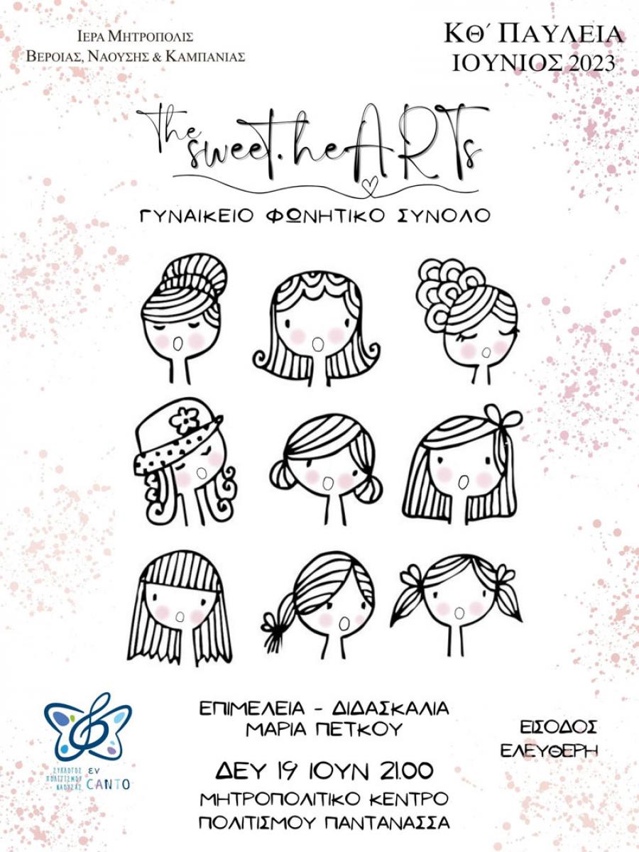 Τη Δευτέρα 19 Ιουνίου 2023 και ώρα 9μ.μ στο Μητροπολιτικό Κέντρο Πολιτισμού «ΠΑΝΤΑΝΑΣΣΑ» στο πλαίσιο των ΚΘ’ ΠΑΥΛΕΙΩΝ και σε συνεργασία με το Ωδείο της Ιεράς Μητροπόλεως μας, θα πραγματοποιηθεί συναυλία του Γυναικείου Φωνητικού Συνόλου "The sweet.heARTs".
