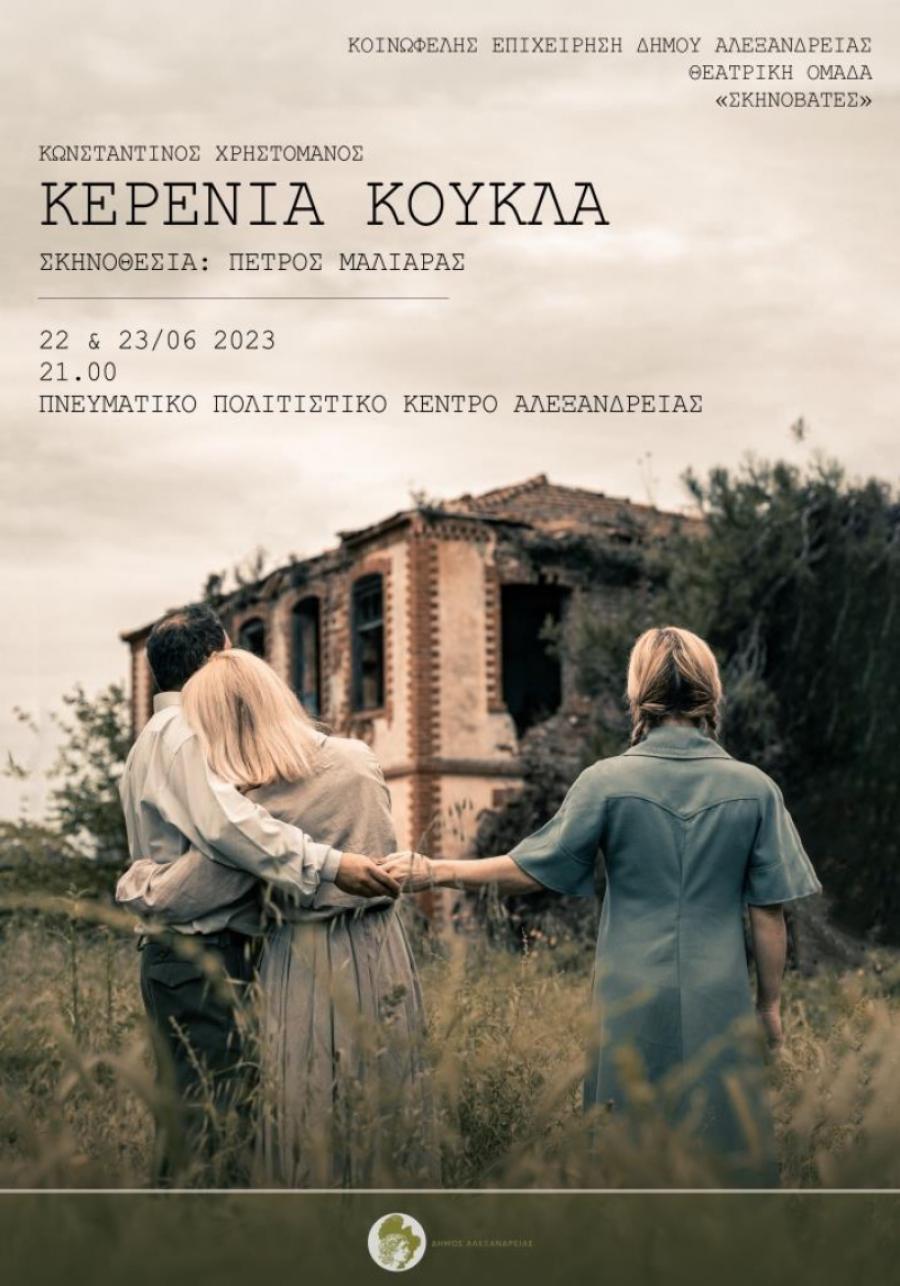 Οι «Σκηνοβάτες» είναι η ερασιτεχνική θεατρική ομάδα του Δήμου Αλεξάνδρειας, με αρκετά χρόνια ενασχόλησης στο ενεργητικό της. Φέτος, αυτής της θεατρικής παρέας, κλήθηκα να αναλάβω εγώ τα ηνία, να την καθοδηγήσω σε μονοπάτια θεατρικά και να την κάνω μια δεμένη και δυνατή ομάδα. Η ομάδα λοιπόν με καλοδέχτηκε, μεγάλωσε, έγινε παρέα αγαπημένη και συνήθεια λατρεμένη! Έτσι, στις 22 και 23 Ιουνίου 2023, ανοίγουμε τις πόρτες του Πνευματικού Κέντρου Δήμου Αλεξάνδρειας, και σας παρουσιάζουμε τη δουλειά μας. Την Κερένια Κούκλα, του Κωνσταντίνου Χρηστομάνου, ένα κείμενο που αγαπήσαμε πολύ, συγκινηθήκαμε, κουραστήκαμε και ιδρώσαμε μαζί του.