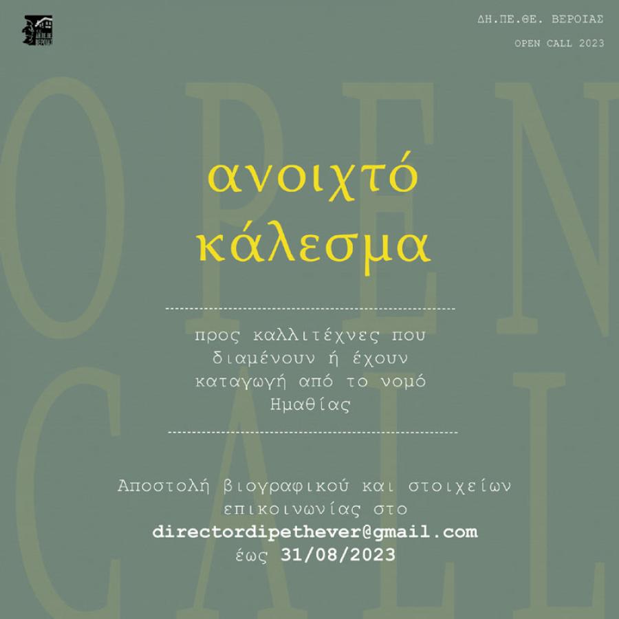 Η Κ.Ε. ΔΗ.ΠΕ.ΘΕ. Βέροιας απευθύνει ανοιχτό κάλεσμα προς καλλιτέχνες (Σκηνοθέτες, Ηθοποιούς, Χορευτές, Χορογράφους, Performers, Σκηνογράφους, Ενδυματολόγους, Συνθέτες, Μουσικούς, Συγγραφείς, Εικαστικούς κ.α.) που διαμένουν ή έχουν καταγωγή από το νομό Ημαθίας.
