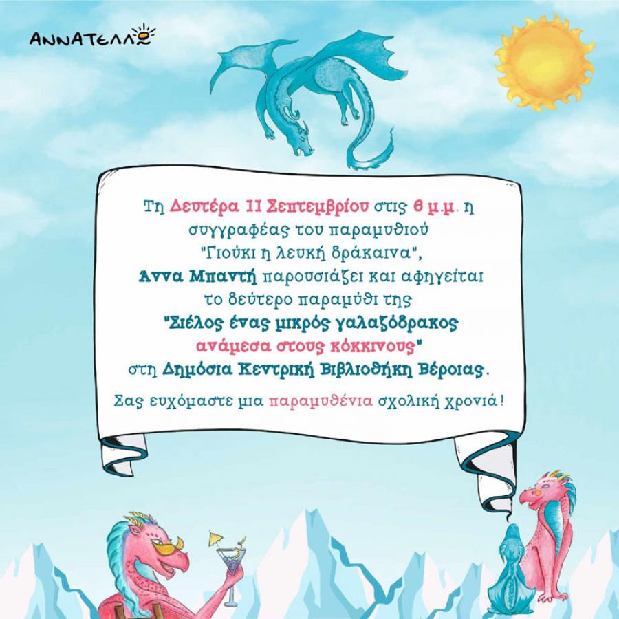 Τη Δευτέρα 11 Σεπτεμβρίου, στις 6 το απόγευμα, σας περιμένουμε στην αίθουσα εκδηλώσεων της Δημόσιας Κεντρικής Βιβλιοθήκης της Βέροιας, όπου η εκπαιδευτικός και συγγραφέας Άννα Μπαντή, παρουσιάζει και αφηγείται το παραμύθι της «Σιέλος ένας μικρός γαλαζόδρακος ανάμεσα στους κόκκινους».