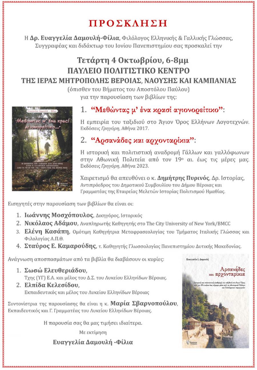 Η Δρ. Ευαγγελία Δαμουλή-Φίλια, Φιλόλογος Ελληνικής & Γαλλικής Γλώσσας, Συγγραφέας και διδάκτωρ του Ιονίου Πανεπιστημίου σας προσκαλεί την Τετάρτη 4 Οκτωβρίου, 6-8μμ ΠΑΥΛΕΙΟ ΠΟΛΙΤΙΣΤΙΚΟ ΚΕΝΤΡΟ ΤΗΣ ΙΕΡΑΣ ΜΗΤΡΟΠΟΛΗΣ ΒΕΡΟΙΑΣ, ΝΑΟΥΣΗΣ ΚΑΙ ΚΑΜΠΑΝΙΑΣ (όπισθεν του Βήματος του Αποστόλου Παύλου) για την παρουσίαση των βιβλίων της.