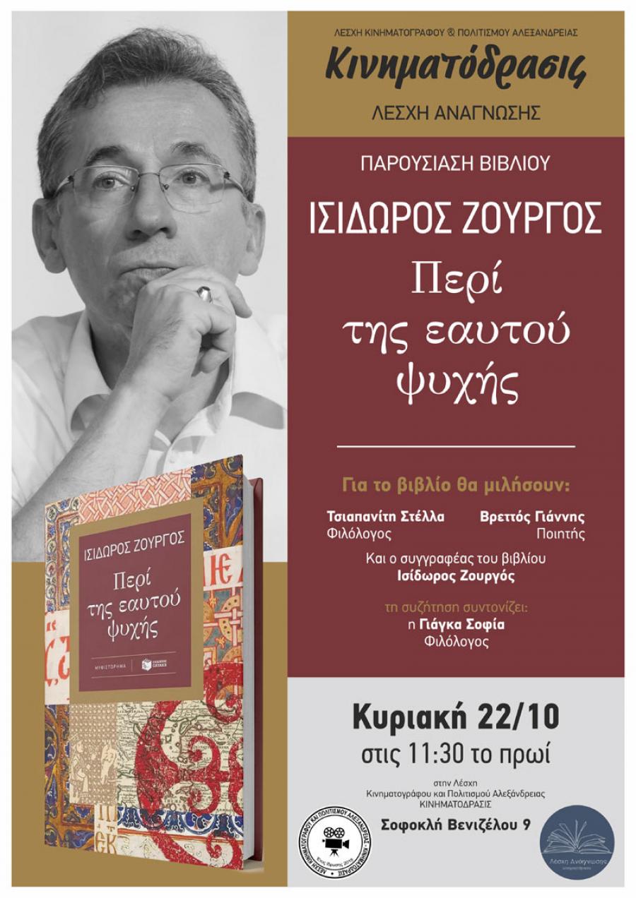 Η Λέσχη Ανάγνωσης της Λέσχης Κινηματογράφου και Πολιτισμού Αλεξάνδρειας σας προσκαλεί στην παρουσίαση του βιβλίου «Περί της εαυτού ψυχής» του Ισίδωρου Ζουργού.