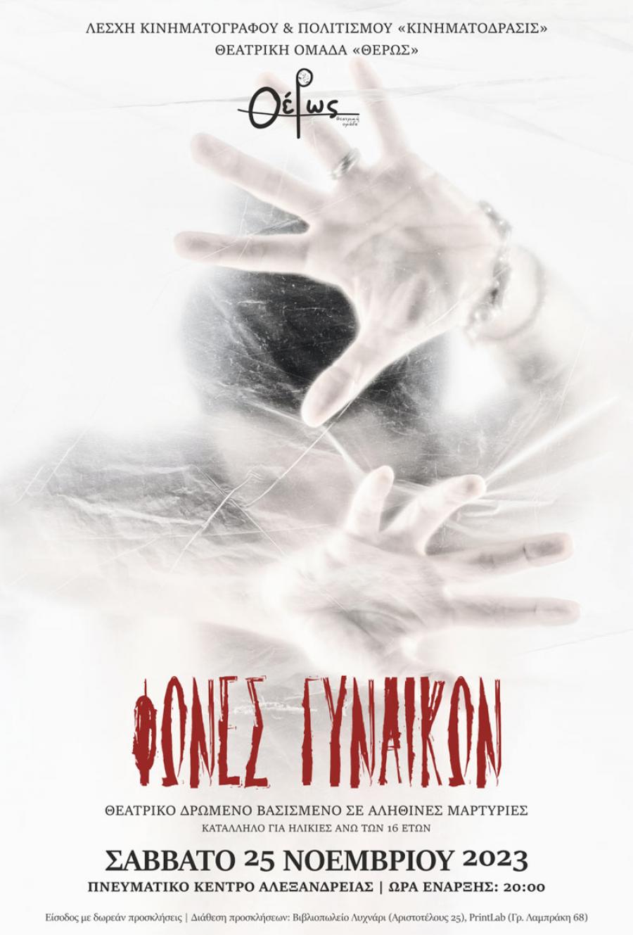 Η Θεατρική Ομάδα «Θέρως» της Λέσχης Κινηματογράφου και Πολιτισμού Κινηματόδρασις, παρουσιάζει το Θεατρικό Δρώμενο “ΦΩΝΕΣ ΓΥΝΑΙΚΩΝ” στο Πνευματικό Κέντρο Αλεξάνδρειας το Σάββατο 25 Νοεμβρίου 2023, στις 8:00 μ.μ.