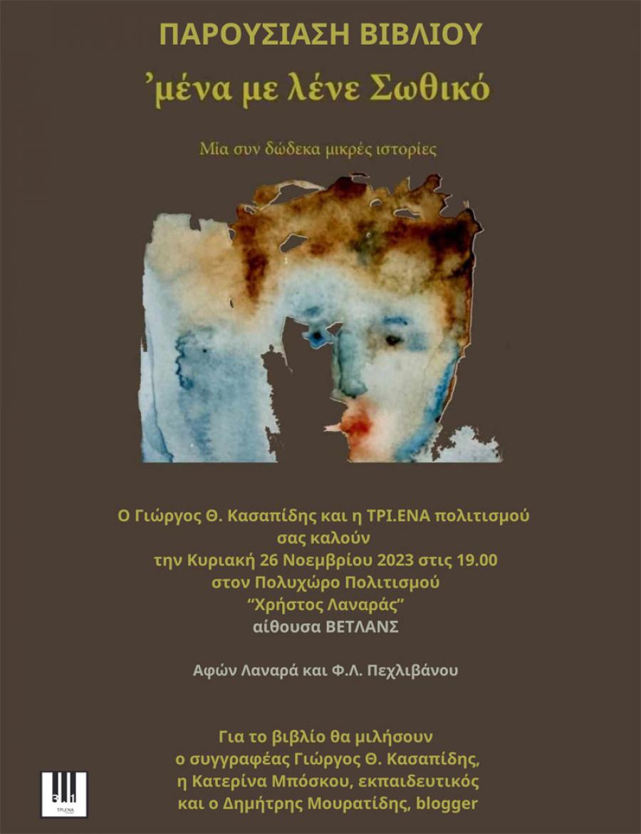 Ο Γιώργος Θ. Κασαπίδης και οι εκδόσεις «ΤΡΙ.ΕΝΑ πολιτισμού» σας προσκαλούν στην εκδήλωση για την παρουσίαση του βιβλίου «‘μένα με λένε Σωθικό» που θα γίνει στον Πολυχώρο Πολιτισμού “Χρήστος Λαναράς”, αίθουσα ΒΕΤΛΑΝΣ, την Κυριακή 26 Νοεμβρίου στις 19:00 στη Νάουσα.
