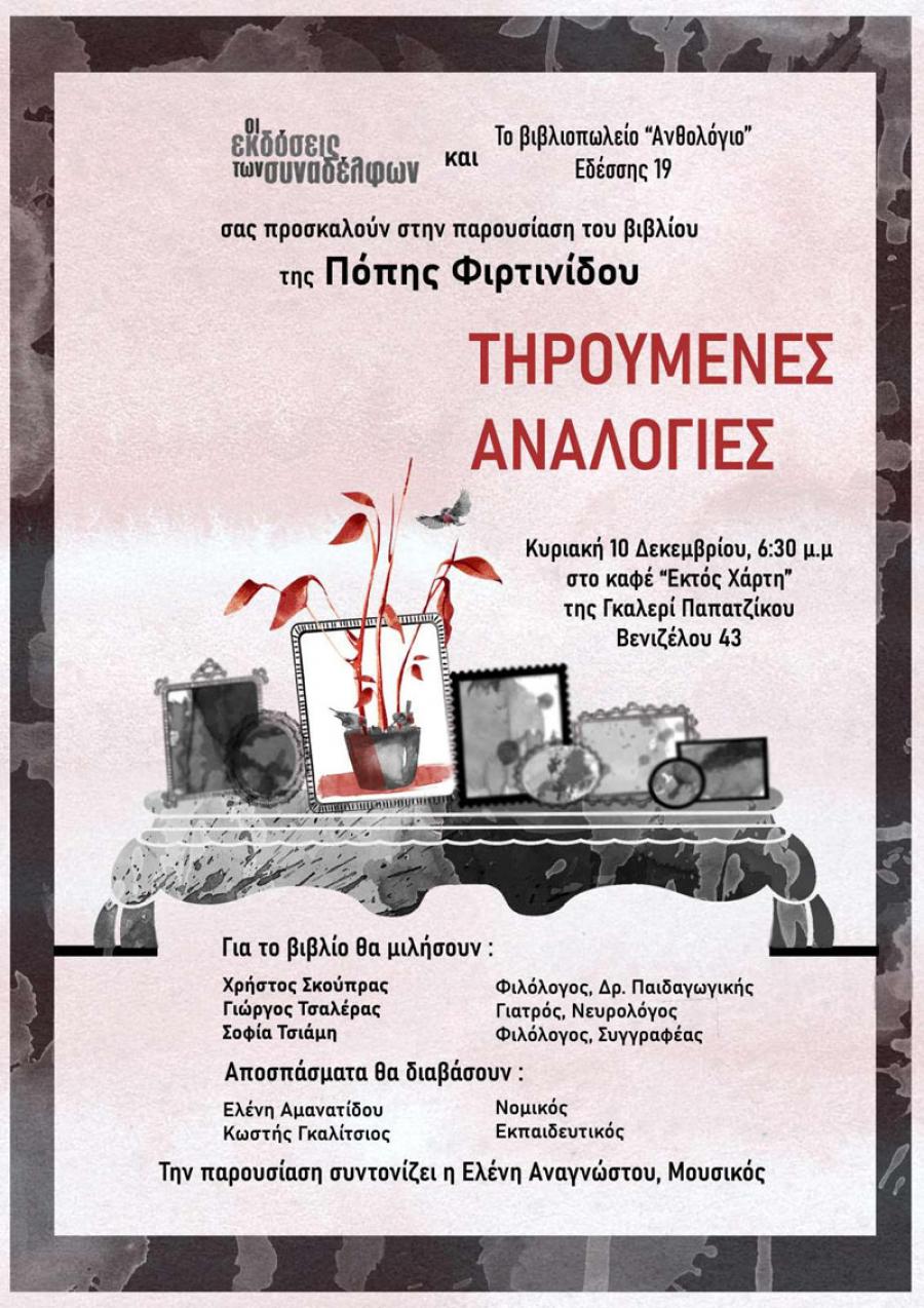 Την Κυριακή 10 Δεκεμβρίου, στις 6.30 μμ, στο καφέ «Εκτός Χάρτη», Βενιζέλου 43, ο εκδοτικός οίκος «οι εκδόσεις των συναδέλφων» και το βιβλιοπωλείο «Ανθολόγιο» διοργανώνουν την παρουσίαση του τέταρτου βιβλίου της Πόπης Φιρτινίδου που κυκλοφόρησε πριν λίγες μέρες υπό τον τίτλο «Τηρούμενες Αναλογίες».