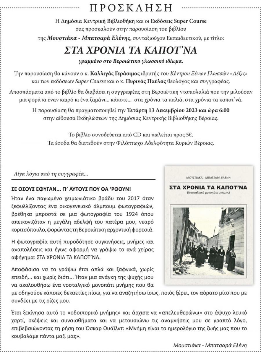 Την Τετάρτη η παρουσίαση του βιβλίου "Στα χρόνια τα καποτ΄να" της Μουστιάκα - Μπατσαρά Ελένης