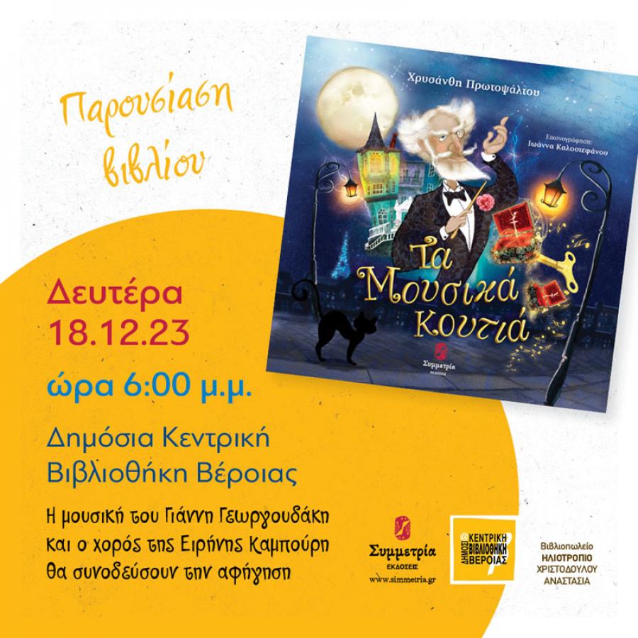 Τη Δευτέρα 18 Δεκεμβρίου 2023, στις 6 το απόγευμα, στην αίθουσα εκδηλώσεων της Δημόσιας Κεντρικής Βιβλιοθήκης της Βέροιας, σας περιμένουμε στην παρουσίαση του βιβλίου της Χρυσάνθης Πρωτοψάλτου «Τα Μουσικά Κουτιά» που κυκλοφορεί από τις εκδόσεις Συμμετρία.