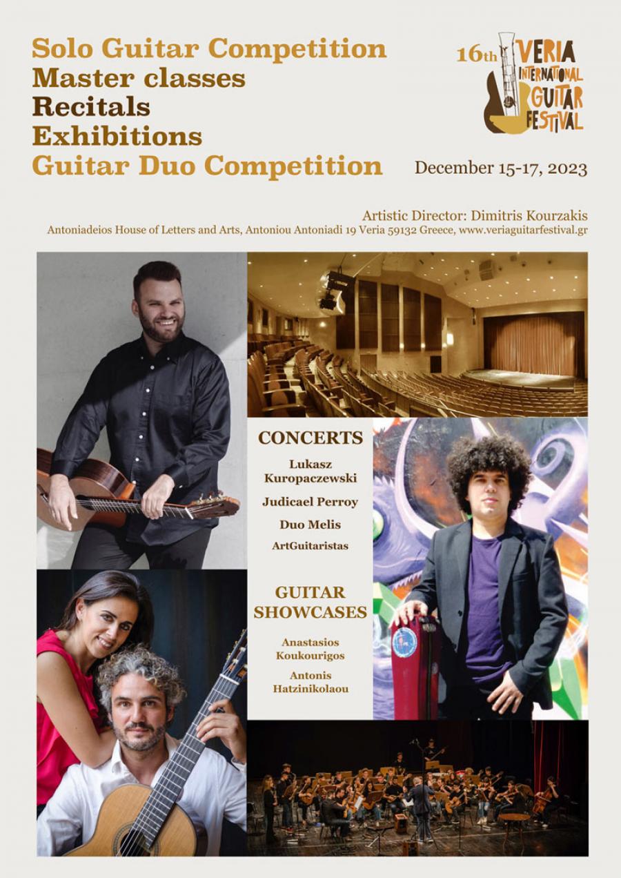 Με την εντυπωσιακή συμμετοχή 36 διαγωνιζόμενων από την Ευρώπη και την Ασία, με ρεσιτάλ δύο φαινομένων του κιθαριστικού στερεώματος, του Πολωνού Lukasz Kuropaczewski και του Γάλλου Judicael Perroy, και με την καθιερωμένη παρουσία του παγκόσμιας εμβέλειας κιθαριστικού ντουέτου Duo Melis (Αλέξης Μουζουράκης – Susana Prieto) θα πραγματοποιηθεί το 16ο Διεθνές Φεστιβάλ Κιθάρας Βέροιας στην Αντωνιάδειο Στέγη Γραμμάτων και Τεχνών, στο Χώρο Τεχνών και στο Δημοτικό Ωδείο ΚΕΠΑ 15 με 17 Δεκεμβρίου 2023. Εκτός από τους διαγωνισμούς κιθάρας με κριτικές επιτροπές που απαρτίζονται από μουσικούς εγνωσμένου κύρους και οδηγούν σε σημαντικά βραβεία, το Φεστιβάλ πραγματοποιεί επιμορφωτικά masterclasses που απευθύνονται σε ντουέτα και σολίστ κιθάρας, καθώς και εκθέσεις των κατασκευαστών κιθάρας Αναστάσιου Κουκουρίγκου και Αντώνη Χατζηνικολάου. Τη διοργάνωση θα ανοίξει, με την καθιερωμένη παρουσία του στο Φεστιβάλ, το μουσικό σύνολο ArtGuitaristas του Δημοτικού Ωδείου ΚΕΠΑ υπό τη διεύθυνση του Πέτρου Ρίστα.