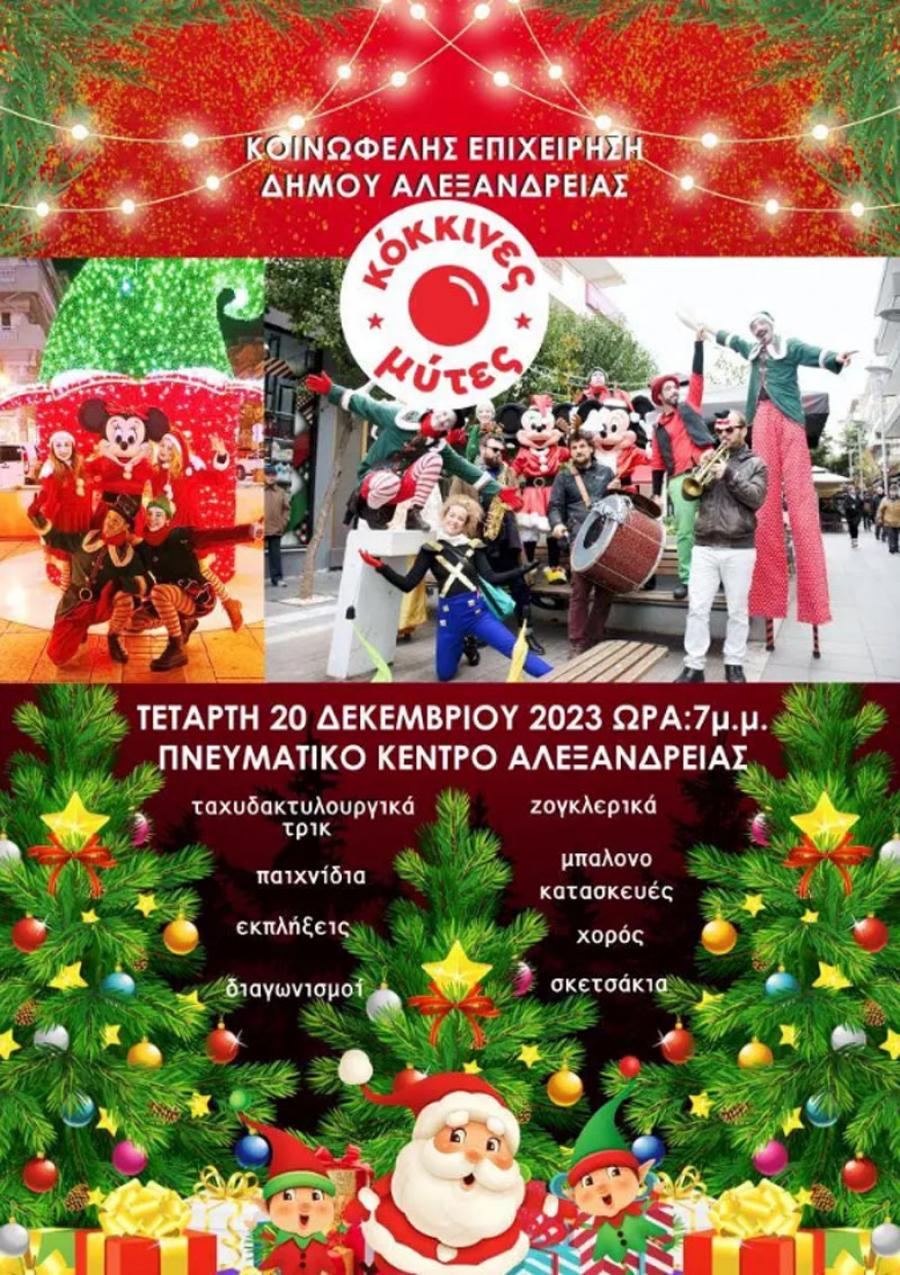 Την Τετάρτη 20/12/2023 και ώρα 7:00μμ στον αύλειο χώρο του Πνευματικού Πολιτιστικού Κέντρου Αλεξάνδρειας θα είναι μαζί μας η ομάδα “Κόκκινες μύτες”.