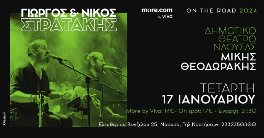 Ο Γιώργος και ο Νίκος Στρατάκης μας υποδέχονται με μεγάλη χαρά την Τετάρτη, 17 Ιανουαρίου στο Θέατρο «Μίκης Θεωδοράκης», στη Νάουσα, για μια μοναδική μουσική βραδιά!