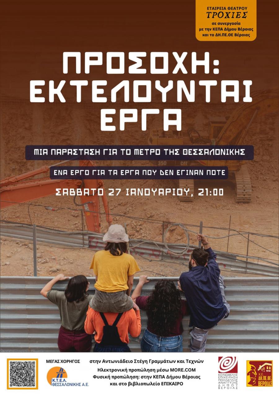 Η Κ.Ε.Π.Α. και το ΔΗ.ΠΕ.ΘΕ. Δήμου Βέροιας φιλοξενούν την παράσταση «ΠΡΟΣΟΧΗ: ΕΚΤΕΛΟΥΝΤΑΙ ΕΡΓΑ» σε σκηνοθεσία της Νοεμή Βασιλειάδου το Σάββατο 27 Ιανουαρίου 2024, 21.00.