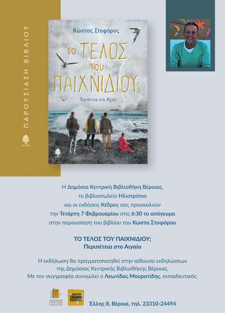Η Δημόσια Κεντρική Βιβλιοθήκη Βέροιας, το βιβλιοπωλείο Ηλιοτρόπιο και οι εκδόσεις Κέδρος σας προσκαλούν την Τετάρτη 7 Φεβρουαρίου στις 6:30 το απόγευμα στην παρουσίαση του βιβλίου του Κώστα Στοφόρου